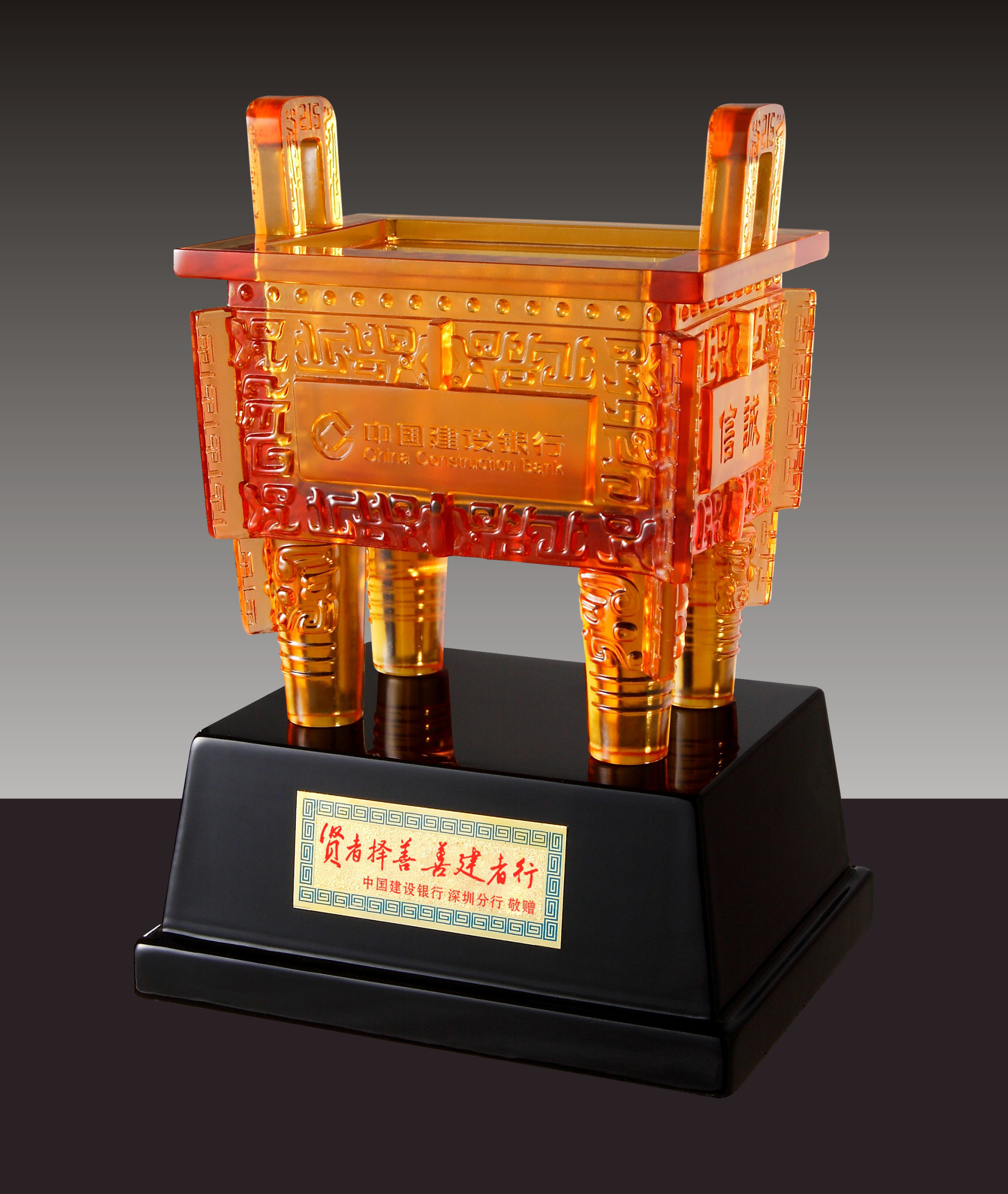 唯雅礼品为“建设银行”个性定制琉璃四方鼎工艺品。