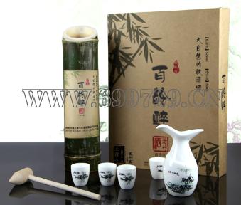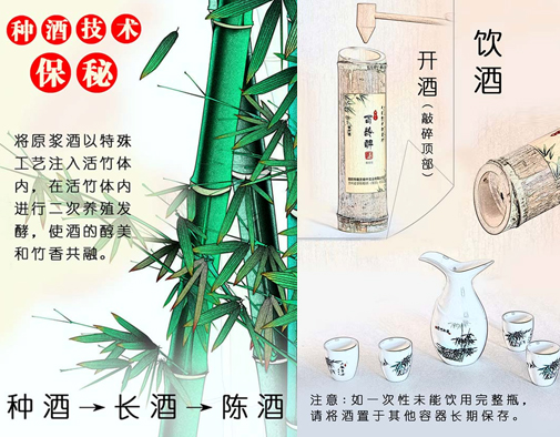 • “神奇”——百龄醉活竹酒,是选用绿色纯天然的中草药,采用独特的“窖外窖”复式发酵工艺。待清明时节再以特殊方法将其注入活竹体内,自然密封后,经竹腔内一年以上,再次发酵,使酒的醇美和竹的清香自然溶合在一起,再将竹子砍下,一款神奇会呼吸的酒就这样诞生了。一颗几十米长的活竹,只能培育出一节活竹酒。