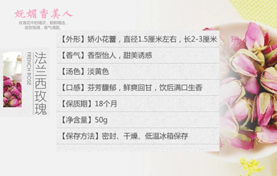 【推荐理由】:玫瑰花含丰富的维生素A、C、B、E、K,以及单宁酸,能改善内分泌失调,玫瑰花茶,性质温和,降火气,可调理血气,促进血液循环,养颜美容。且有消除疲劳,愈合伤口,保护肝脏胃肠功能,长期饮用亦有助于促进新陈代谢。