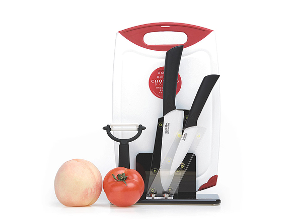 【产品描述】: 6”陶瓷厨师刀、4”陶瓷水果刀、陶瓷刨、PP菜板、亚克力刀架、彩盒包装。