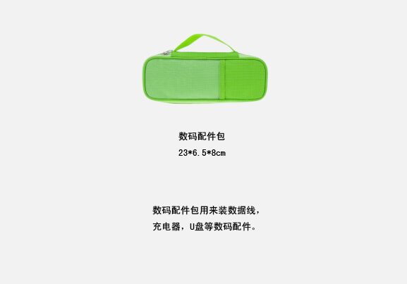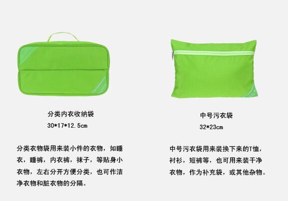 【套装配置】:衣物袋+分类衣物袋+洗漱包+鞋袋+中号污衣袋+小号污衣袋+数码配件包