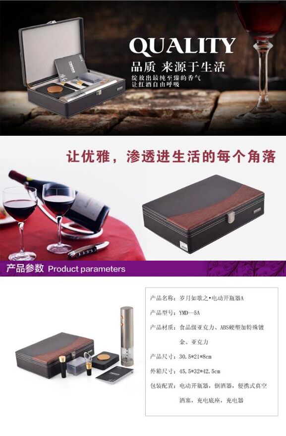 【产品配置】:电动开瓶器,倒酒器,便携式真空酒塞,充电底座,充电器.