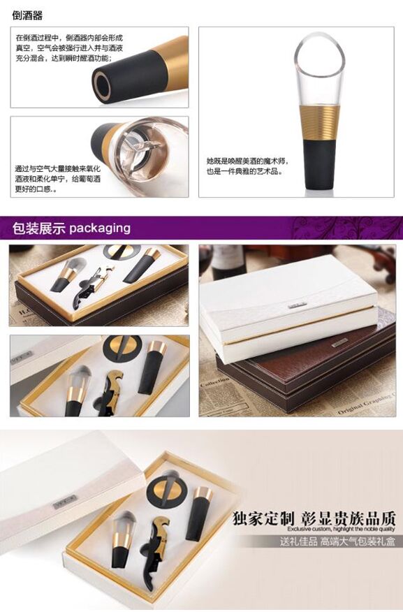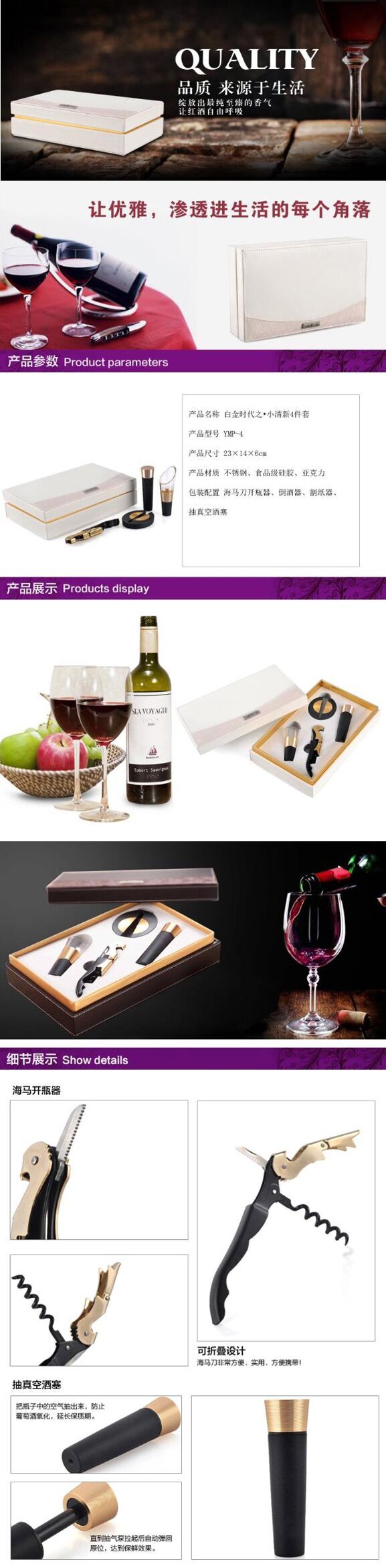 【产品配置】:割纸器,倒酒器,海马不锈钢开瓶器,便携式抽真空酒塞,止酒环。