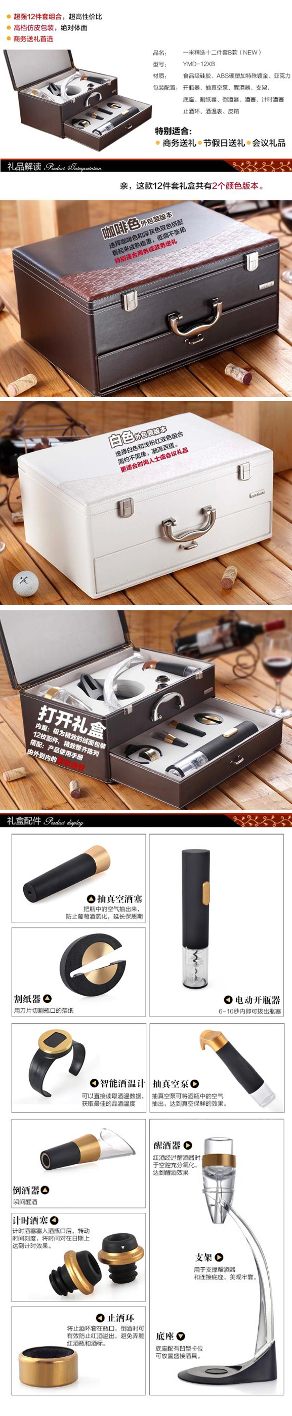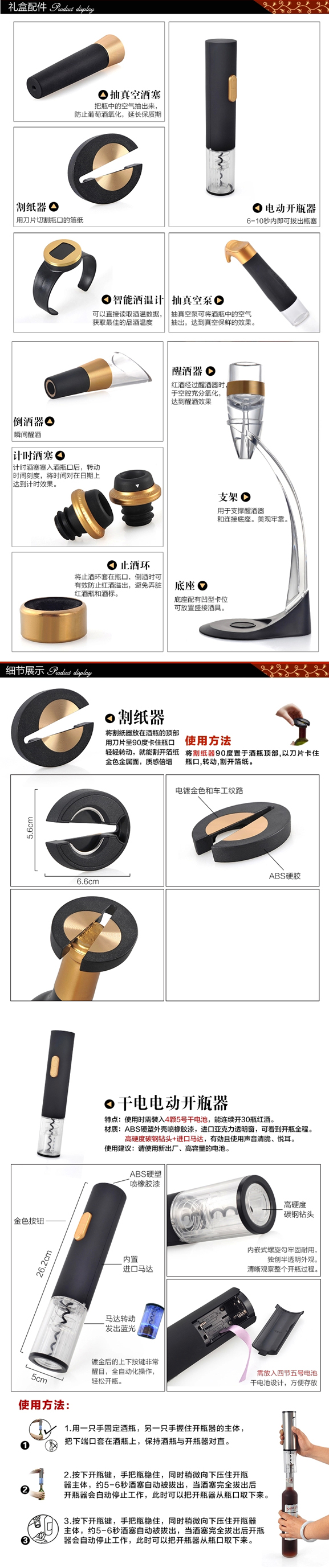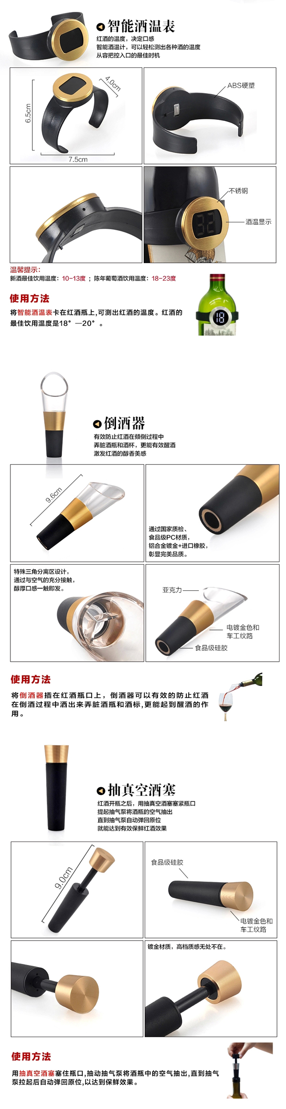 【产品配置】:干电电动开瓶器,割纸器,倒酒器,真空酒塞,智能酒温表,止酒环,分体式醒酒器