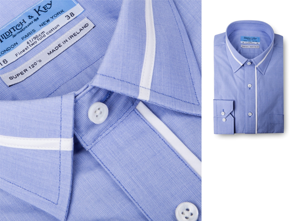 100%长绒棉,经典蓝色面料,领门襟镶拼白色,小尖领,斜角袖口,时尚不失稳重。