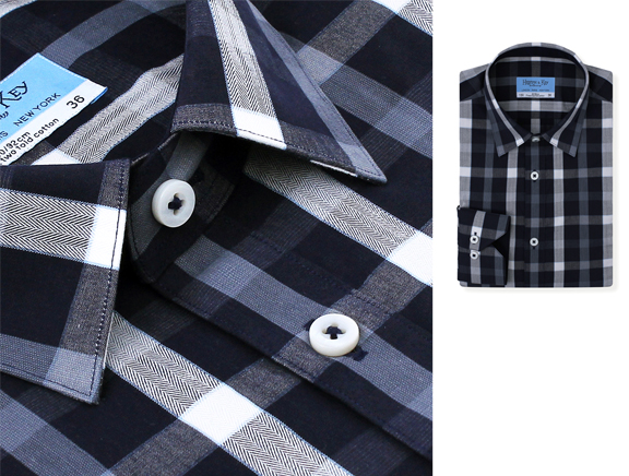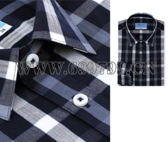 100%长绒棉,蓝白灰三色格纹,小方领,白色蝶贝扣,袖扣带斜角。