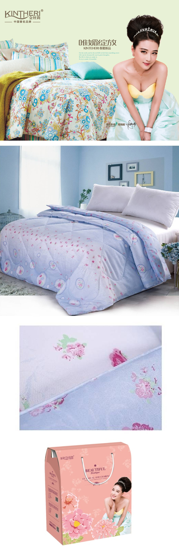 产品描述:优异睡眠,从舒馨美肤被开始。柔丝棉的吸湿透气,舒适不刺激与高弹透气纤维带来特有的质感完美结合,手感蓬松,富有弹性,不易掉毛起球,光泽柔和,手感细柔,触感舒适、柔软。精细绗缝,不易变形。正反面两用设计,结合飘逸唯美的花型,可以让你随心搭配,想盖哪面就哪面。让您每一天的睡眠都在享受中度过。特有防霉防蛀的功效,睡得安心。