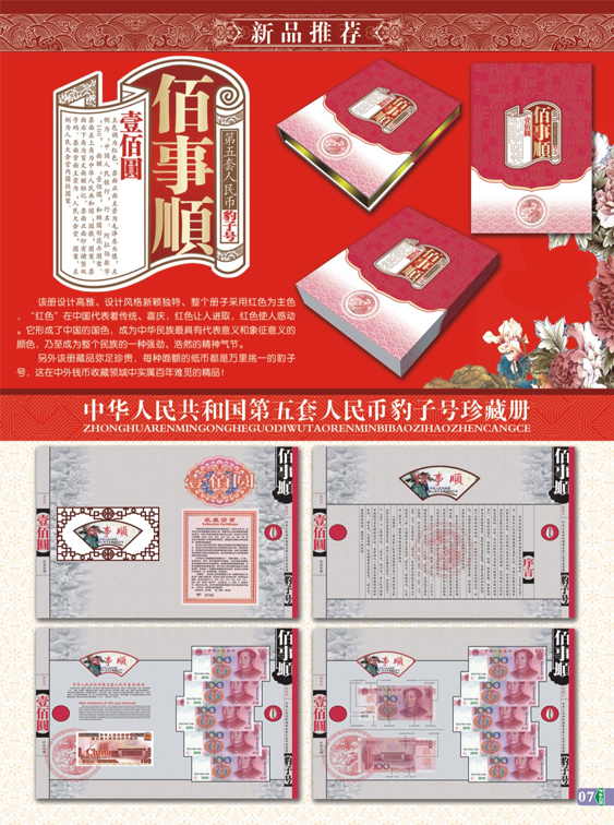 第五套人民幣一百元十連紙幣百事順珍藏冊冊內包含:第五套人民幣一百元面值紙幣十張,貝幣一枚。紙幣號碼規律為豹子號,例如:xxxxx111—xxxxx999。