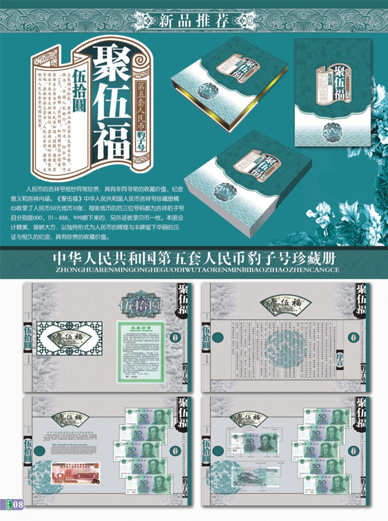 人民币的吉祥号纸钞异常珍贵,具有非同寻常的收藏价值、纪念意义和吉祥内涵。《聚伍福》中华人民共和国人民币吉祥号珍藏册精心收录了人民币50元纸币10张,每张纸币的后三位号码都为吉祥豹子号且分别为000、111----888、999顺下来的,另外还收录贝比一枚。本册设计精美、装帧大方,以独特形式为人民币的辉煌与丰碑留下华丽的见证与恒久的纪念、具有珍贵的珍藏价值。
