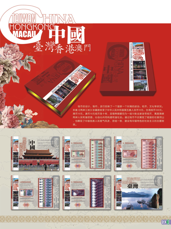 册内收录了中华人民共和国第五套人民币纸币10元十张,香港货币港币10元十张,澳门货币澳门币10元十张,台湾货币台湾比100元十张,两岸三地的设计寓意海峡两岸人民和谐团圆、心连心共同构建和谐社会,通过钱币不仅展现了祖国的壮丽河山,也展现了中国各族人民意气风发,团结一致,建设有中国特色的社会主义的主题思想。