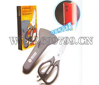 设计巧妙,一剪多用,具有削皮刀,瓜创,开瓶启,一字启,剪刀,鸡骨剪等功能,进口不锈钢生产,品质精良,盒身可吸附于冰箱等物体上,更好展示广告。