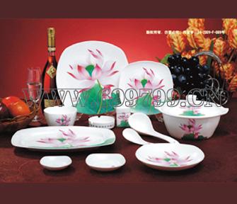 荷花又称莲花、水莲、水芙蓉、净客、玉环等。性高洁,姿高雅。此套器皿以荷花为主饰,写荷花红妆粉盈,荷叶翻盖溢翠,正是风流丽质,其工笔勾描,没骨设色。无怪乎得到江西版权局认证,予以产权保护。