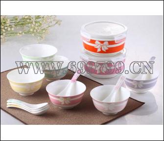 规格尺寸: 材 质:低骨瓷 ; 配 套:6只骨瓷金钟碗、6只弯勺、2只保鲜碗