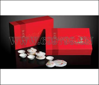 茶品采用08年广州茶叶展览会特别金奖原料配制。并配赠定制茶具,小杯上的六条活灵活现的金鱼,象征六六大顺、年年有余;盖碗上九条金鱼,象征天长地久,好一派怡然自得、美满吉祥的人间美景。