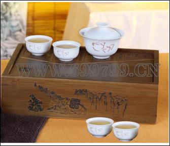 规格尺寸 : 材 质 老宗孟竹、玉脂瓷 ; 配 置 茶盘、盖碗各一个,茶杯四个,茶巾一条,布艺包装。