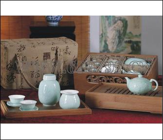 产品简介 :此款茶礼器皿齐全,外观大气:翠绿色的阴雕瓷器冰清玉洁,肌理细腻, 光鲜夺目; 竹盒的手工雕刻缠枝纹,苍劲有力,饱满富贵。整套茶盘分三层,面板可做奉茶托使用,茶盘及瓷器可置于外布包中,方便携带。高价位、高配置茶礼首选,适用于商务,庆典,国宾礼品。