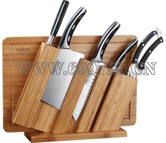 配置:切菜刀、三德刀、 水果刀、万能剪、磨刀棒、 开槽碳化竹抑菌刀架、高强度切菜板