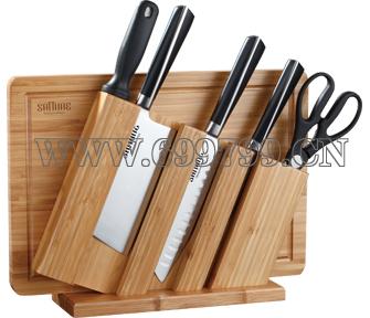 配置:切菜刀、三德刀、 万用刀、厨房剪、磨刀棒、 开槽碳化竹抑菌刀架、高强度切菜板