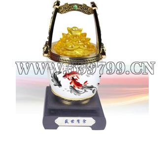 寓意: (1)一桶金寓意财富; (2)合金镀金提手、高档骨瓷、配合精致的琉璃、镶钳的宝石,整个产品就是一个艺术品,象征富贵、代表身份; (3)桶身上游动的鱼代表灵动、生发,财生财之意。