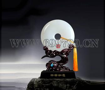 【造型】本款木座造型古朴又不失现代简约,如意顶镶绿松宝石,卷动祥云腾空而起,展开如凤凰展翅,托出平安扣如一轮明月,吉祥又如意!摆放书架案头,即可消灾平安,又可陶冶情操.