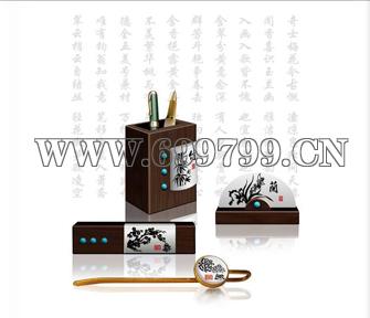 【造型】文房办公实用首选,高档实木镶上白玉与绿松宝石,印上四君子图案,尽显主人高风亮节