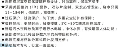 规格尺寸:65*65*235mm 容量:380ML 额定功率:95W 额定电压:12V 可选颜色:玻璃本色