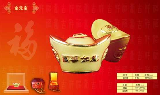 元宝原是我国特有的古钱币,用金,银诸造,其造型浑厚墩实。现在金元宝则参照古代元宝的独特造型,以花纹,配以吉语,融传统名族风格与现代审美情趣与一体。图案采用新工艺处理是花纹亮丽,更显华贵典雅。它不但具有鉴赏性纪念性、包值性永久收藏品,也是具有名族风采的馈赠海内国际贵宾高档礼品。本元宝限量定制,具有收藏价值。
